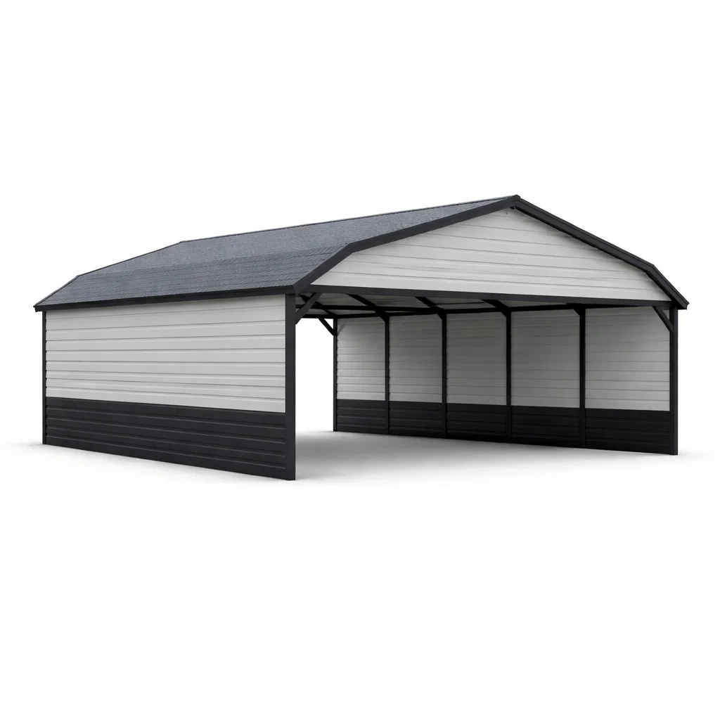 Carport esterno in acciaio grigio e bianco con struttura aperta