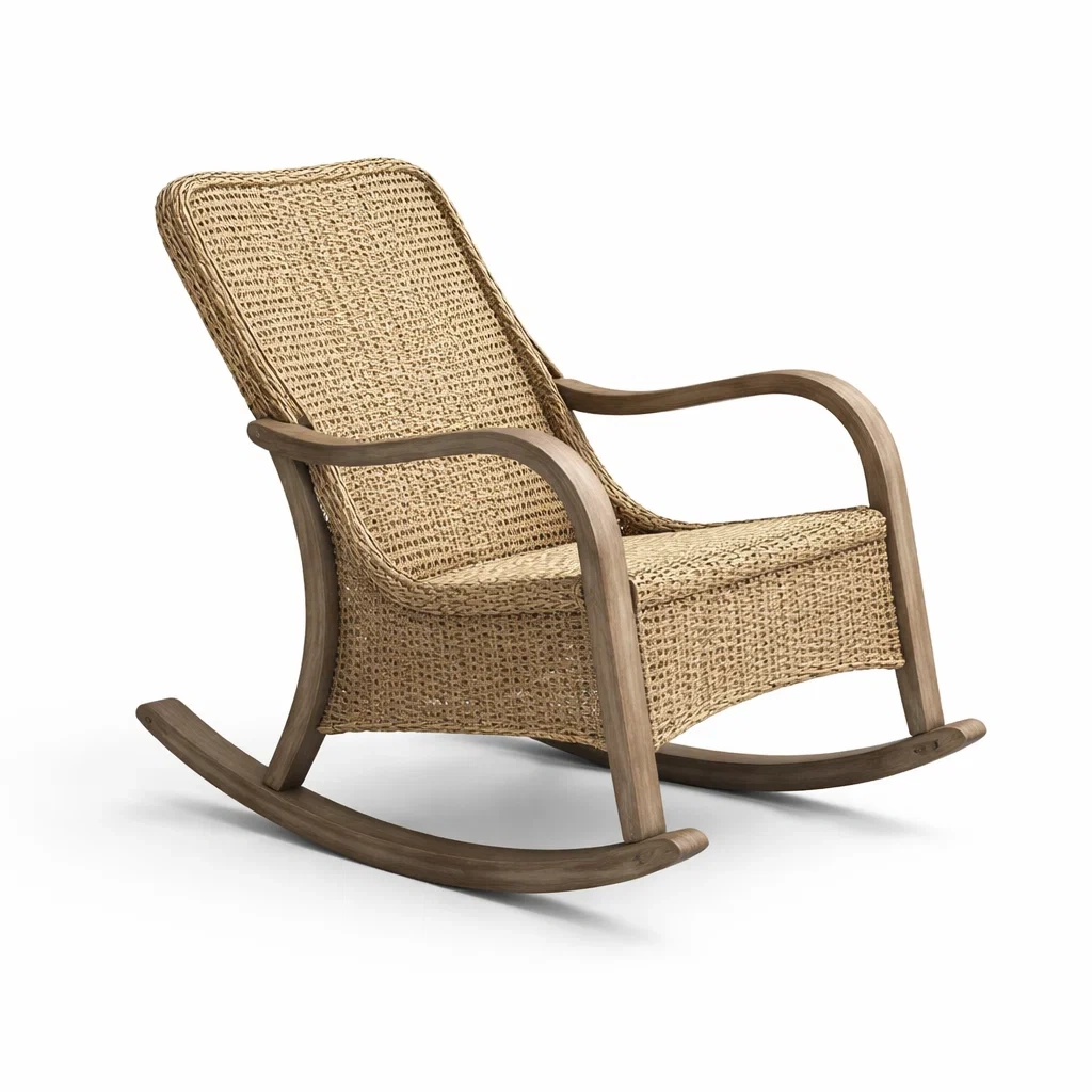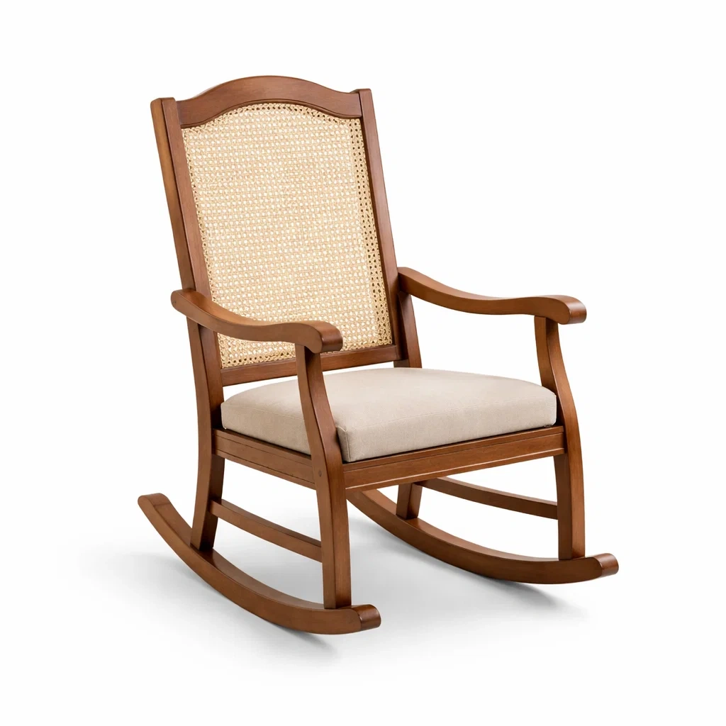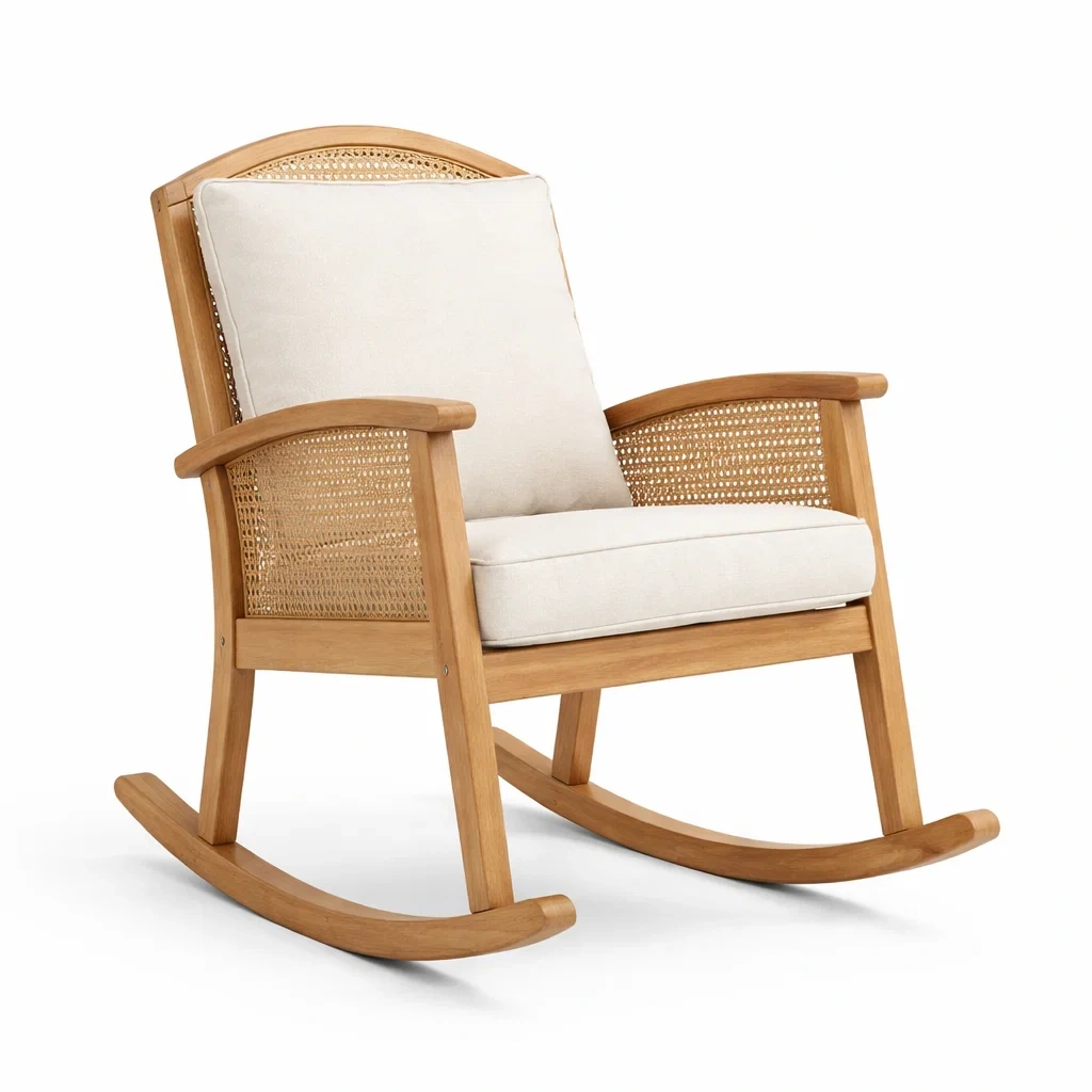 Sedia a dondolo in legno e rattan con sedile in poliestere