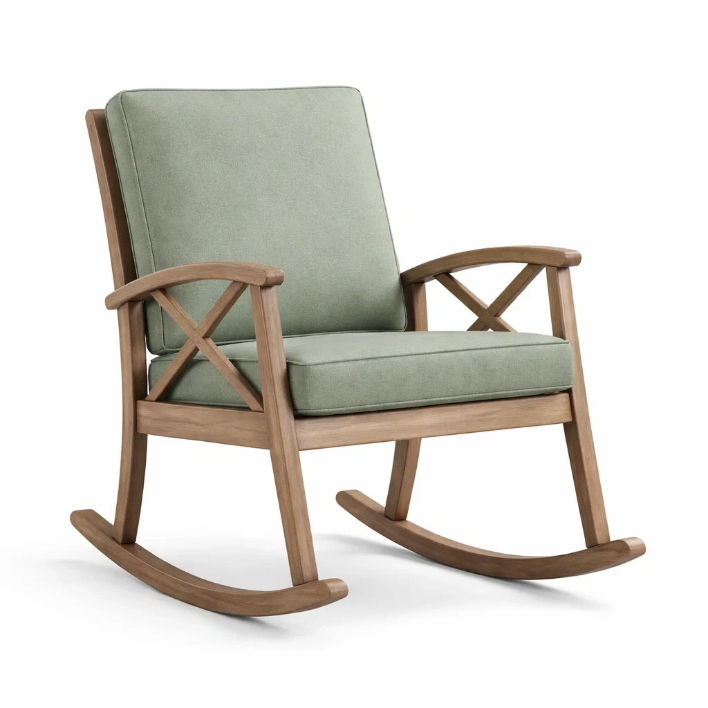 Sedia a dondolo in legno con cuscini in tessuto verde