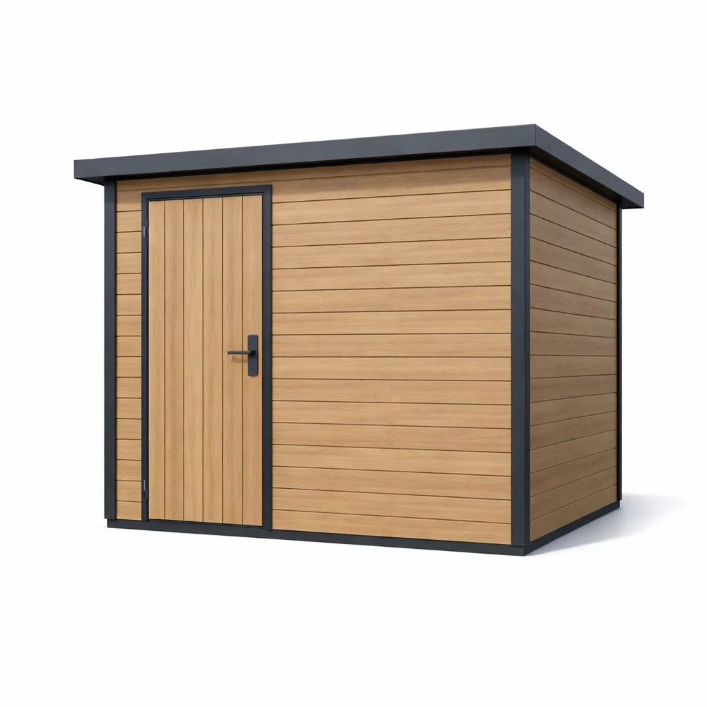 Corpo principale: realizzato con pannelli in legno composito con struttura in acciaio verniciato a polvere, offre protezione dagli agenti atmosferici.